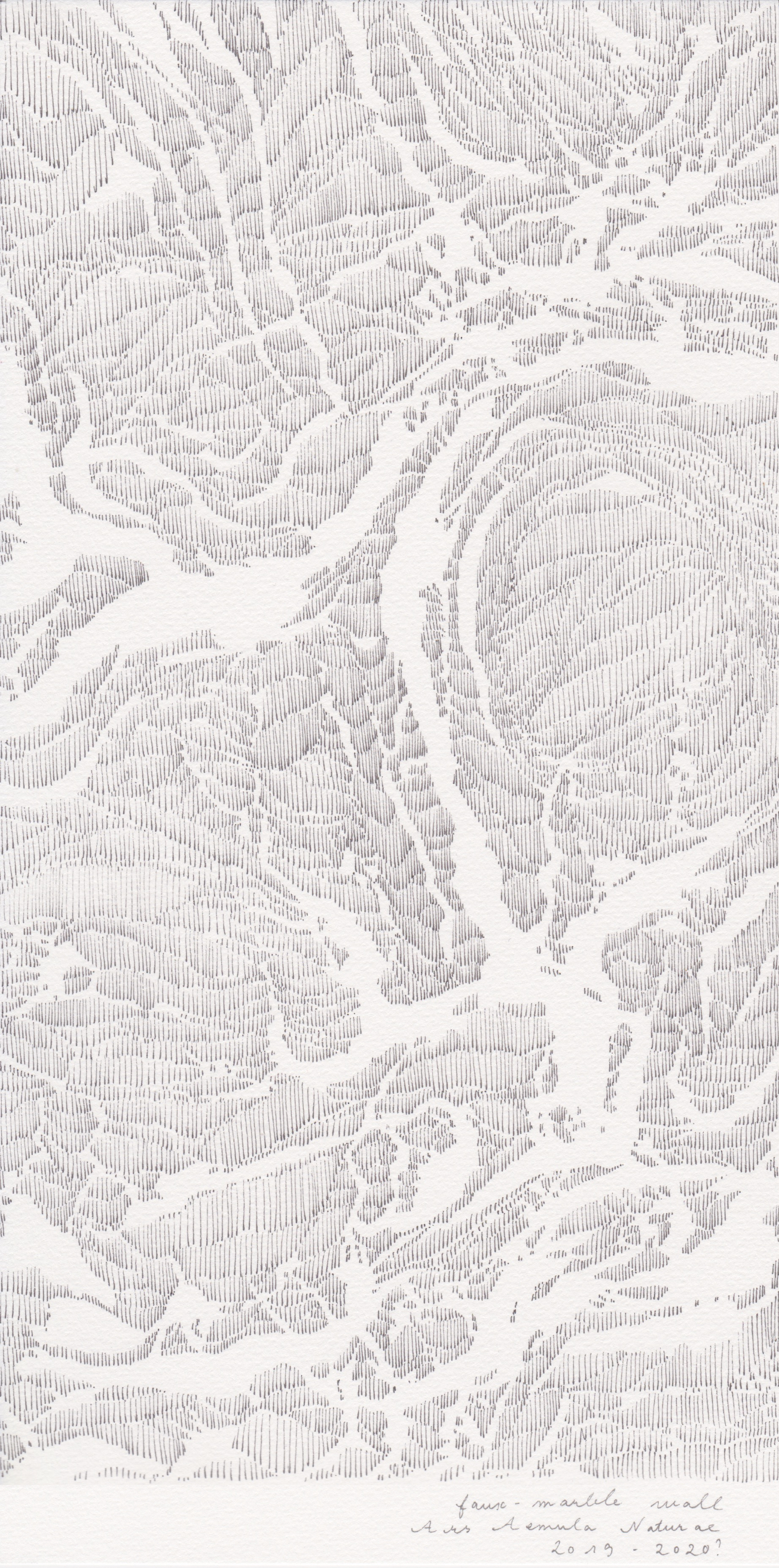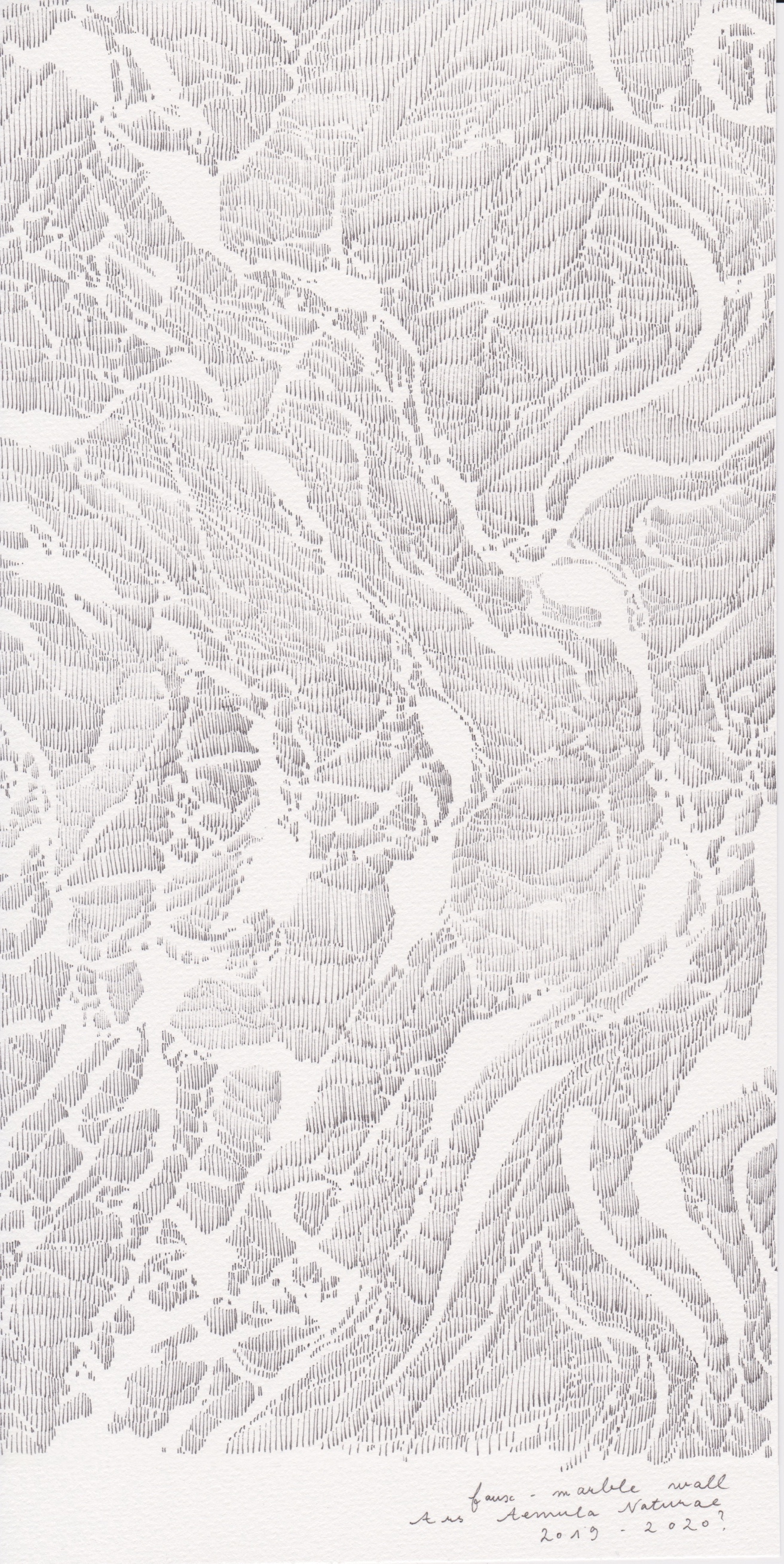 The Very Rich Hours 3 and A Non-Statement 2, fineliner and decalcomania on paper, presented on wood with magnets, 41 x 976, 2024-2025